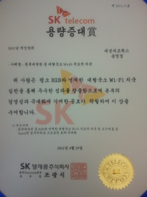 송영섭차장 SK-Telecom '용량증대상' 수상!