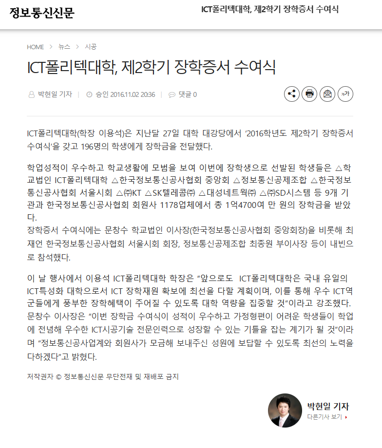 한국정보통신기능대학 2016학년도 2학기 장학증서 수여식