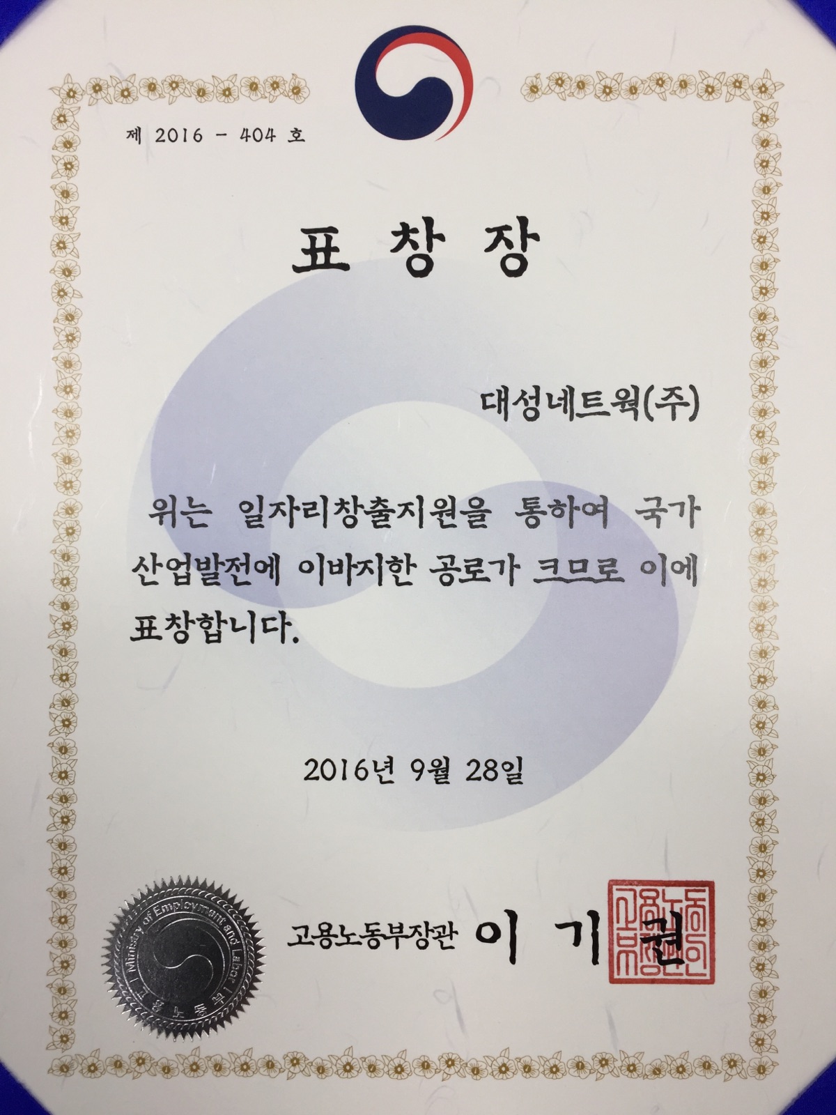 고용노동부 일자리 창출 표창